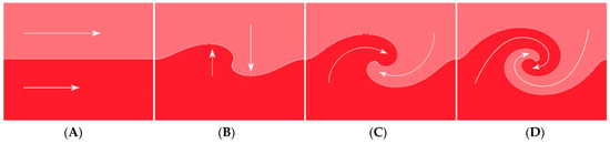 When the velocity and pressure differences between the central and peripheral layers reach a critical threshold, the innermost layers detach from the boundary layer of the inner wall (Figure 12). This detachment causes the layers to curl upon themselves, resulting in the formation of recirculating flows and a stagnant area near the wall. Within this stagnant region, the flow velocity decreases, and pressure increases according to the Bernoulli equation. If the recirculating flows are sufficiently strong, they can evolve into vortices—swirling masses of fluid with rapid rotational motion. Ultimately, these vortices gradually decay into disorganized flow or turbulence (Figure 9A–D) [18].