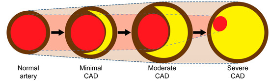 Compensatory expansion of the coronary artery so the surface area of the lumen (in red color) stays unchanged even when the plaque volume (in yellow color) increases (Adapted from reference [19]).