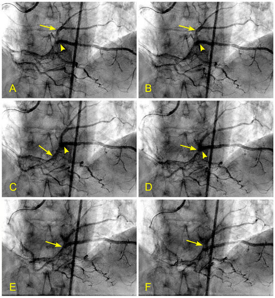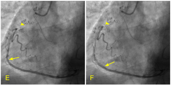 In patients with lesions in the distal RCA, proximal to the bifurcation with a posterior descending artery, the mechanism of recirculating flow could be similarly applied. However, lesions form due to recirculating flow in the separation zone where the blood converges from the two branches in the retrograde direction (Figure 14A,B and Figure 15A–F).
