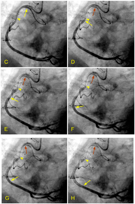 (A,B) Antegrade flow in the right coronary artery (RCA). These images are in continuous sequence. (A) The artery is completely full of contrast in black. There is a severe 80% lesion in the mid-segment of the RCA (arrowhead). (B) In the ostium of the RCA, the blood, in white, moves in at the beginning of diastole (arrow). (C–F) Antegrade and retrograde flows in the right coronary artery (RCA). (C) Now, the blood, in white, continues to move in at the proximal segment of the RCA (arrow). (D) The blood, in white, reaches the center of the mid-segment where the lesion is located (arrowhead). The contrast looks darker. This is the interface location between the antegrade and retrograde flow at the transition from diastole to systole. (E) The blood, in white, reaches the beginning of the distal part of the mid-segment (arrow). At this location of the transition between systole and diastole, the contrast still looks dark (arrowhead). (F) The contrast looks darker in the mid-segment, and in the proximal segment, the contrast in black looks darker and is at a standstill (red arrow). (G,H) Antegrade and retrograde flow in the right coronary artery (RCA). (G) The blood, in white, reaches the beginning of the distal segment (arrow). At the location of the transition between systole and diastole, the contrast still looks dark (arrowhead). The contrast looks darker in the proximal segment, where the contrast in black is at a standstill (red arrow). (H) The blood, in white, reaches the middle of the distal segment (arrow). At the location of the transition between systole and diastole, the contrast still looks less dark (arrowhead). The contrast looks lighter in the proximal segment (red arrow).