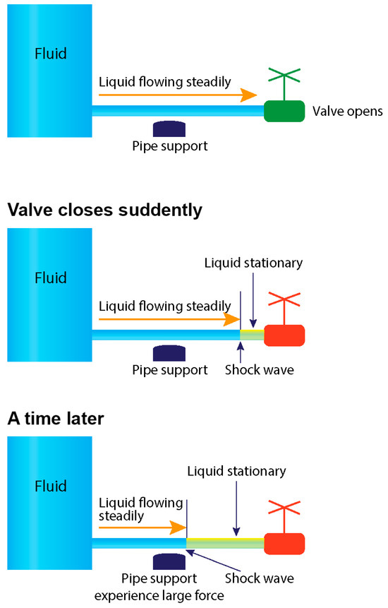 Water hammer shock, or hydraulic shock, is a transient phenomenon in fluid flow systems, particularly in pipelines. It occurs when there is an abrupt change in flow velocity or direction, typically triggered by sudden valve closures or rapid pump start/stop actions [27]. This sudden change in flow velocity generates a pressure surge within the system, accompanied by the formation of pressure waves that propagate through the fluid at the speed of sound, exceeding the actual flow velocity. When these pressure waves encounter alterations in the pipe system, such as closed valves or bends, they reflect back into the pipe, leading to a subsequent pressure build-up. As these pressure waves reflect back and forth within the pipe system, they can amplify each other, resulting in a rapid increase in pressure—a phenomenon known as the water hammer effect. The sudden surge in pressure can exert significant stress on the pipe walls, potentially causing vibrations, noise, and damage to pipes, fittings, and other system components if not adequately controlled (Figure 18).