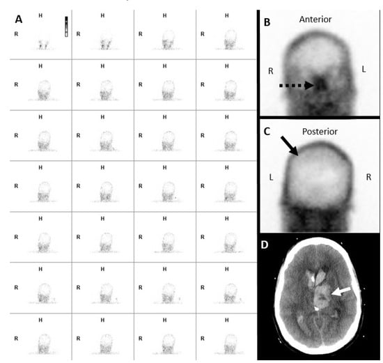 Forty-four-year-old female. A Tc-99m DTPA nuclear scintigraphy study after the injection of 25.5 mCi of Tc-99m DTPA. (A) Initial blood flow phase image series at 2 s intervals. (B,C) Delayed static images at 20 min after tracer injection in (B) anterior and (C) posterior projections. Initial flow images demonstrate tracer activity in bilateral extracranial carotid arteries without intracranial tracer activity. Delayed static images of the brain demonstrate a lack of tracer activity in the supra and infratentorial brain parenchyma. These findings satisfy the criteria for a complete lack of cerebral perfusion. Noted are the “hot-nose sign” (dashed black arrows in (B)) and “empty light-bulb sign” (solid black arrows in (C)). (D) Unenhanced axial CT brain in brain window demonstrates acute parenchymal hemorrhage in left basal ganglia (solid white arrow) with the intraventricular extension of hemorrhage with the associated mass effects and midline shift.