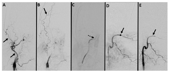 Digital subtraction angiography (A–C) right carotid and (D,E) vertebral artery. Lack of visualization of ICA beyond the petrous segment (dashed black arrow in (C)) and vertebral artery beyond the intradural segment (solid black arrows in (D,E)) with the normal contrast opacification of the right external carotid artery and its branches (solid black arrows in (A,B)). (Case courtesy—Dr. Anne Osborn).