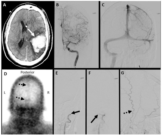 Fifty-four-year-old female with BD/DNC in the clinical deterioration of intracranial hemorrhage. (A) Unenhanced axial CT brain at the initial presentation demonstrates parenchymal hemorrhage in the left fronto-parietal lobe with mass effect (solid white arrow) with associated subarachnoid hemorrhage. (B) Arterial and (C) venous phase of carotid angiogram at the initial presentation does not demonstrate active contrast extravasation with patent intracranial arterial and venous circulation. Patient clinically deteriorated over a period of 7 days with clinically absent brain stem reflexes. (D) Faint intracranial midline tracer activity on Tc-99m DTPA nuclear scintigraphy favoring the inconclusive diagnosis of the BD/DNC (dashed black arrows in (D)). (E–G) Follow-up catheter angiography was performed, and it confirms the diagnosis of BD/DNC where nuclear scintigraphy was inconclusive. There is the non-visualization of internal carotid artery beyond the petrous segment (solid black arrows in (E,F)) with the contrast opacification of branches of external carotid arteries (dashed black arrow in (G)).