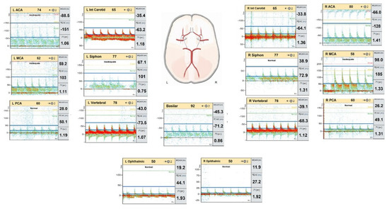 TCD ultrasound provides rapid, noninvasive, operator-dependent, real-time measures of cerebrovascular function. TCD is cheaper, safer, and readily available. TCD can be used to measure the flow velocity in the brain’s basal arteries to assess relative flow changes. According to Monteiro et al., TCD is 89% sensitive and 99% specific for diagnosing BD/DNC [42]. A 2 MHz probe is used for TCD. To evaluate the middle cerebral arterial waveform, the transducer is placed in the bitemporal window above the level of the zygomatic arch. And for the evaluation of the vertebrobasilar arterial waveform, the transducer is placed posteriorly in the suboccipital window. Typically, antegrade flow is observed in the bilateral intracranial cerebral arteries (Figure 6). Reverberating, absent, or oscillatory flow are diagnostic for BD/DNC. For confirmation, there is a need to perform two examinations 30 min apart [29]. False negative TCD results are seen in post-craniotomy patients, and TCD does not directly evaluate the brain stem function [43]. According to Riggs et al., the central retinal artery Doppler can be considered as an ancillary test in the pediatric patient through an eye window [44].