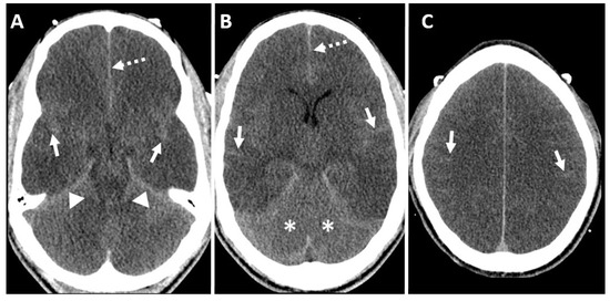 Unenhanced axial CT brain (A) at the level of the temporal lobe, (B) at the level of basal ganglia, and (C) at the level of centrum semiovale demonstrate diffuse cortical edema in supratentorial brain parenchyma with blurring of the gray-white matter interface with increased attenuations of the sulci (solid white arrows in (A–C)), interhemispheric falx cerebri (dashed white arrow in (A,B)) and bilateral tentorial cerebri (solid white arrow heads in (A)), resulting in a false appearance of subarachnoid hemorrhage also called “Psuedosubarchnoid hemorrhage”. There is a slight hyperdense appearance of the cerebellum (white stars in (B)) called “white cerebellum” or “cerebellar reversal sign”.