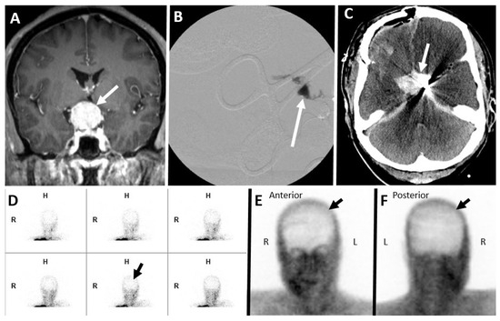 Forty-nine-year-old female with suprasellar mass lesion. (A) Coronal T1 post contrast image shows enhancing suprasellar mass lesion (white arrow in (A)). Patient underwent surgical resection and developed intra-operative massive bleeding. (B) Intra-operative fluoroscopy image shows contrast extravasation from avulsed cavernous left internal carotid artery, and the patient underwent embolization and repair for the same issue. (C) Axial unenhanced CT image of the brain shows hematoma in the basal cistern (white arrow) with streak artifact from the coil embolization of left internal carotid artery with post-surgical change. Tc-99m DTPA nuclear scintigraphy study, (D) initial blood flow phase images, (E) static anterior, and (F) posterior images demonstrate the absence of intracranial tracer activity (black arrows in (D–F)), confirming BD/DNC. There is tracer activity in the right scalp from recent surgery.