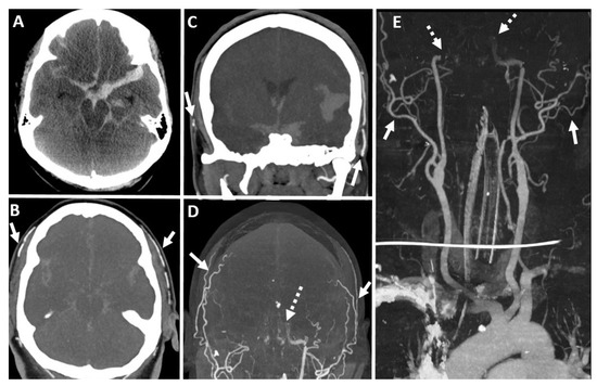 (A) Unenhanced axial CT brain image, (B) axial MIP (maximum intensity projection), (C) coronal MIP, (D) 3D coronal reconstruction of head, and (E) 3D coronal reconstruction of CT neck angiography after an injection of 80 mL contrast iopamidol injection 76% (Isovue 370, Bracco) in a patient with BD/DNC. There is diffuse subarachnoid hemorrhage with cerebral edema (A). CT head and neck angiography demonstrate the contrast opacification of bilateral external carotid arteries and its branches (solid white arrows in (B–E)). The contrast opacification of the bilateral internal carotid artery up to the petrous segments (dashed white arrows in (D,E)). The absence of the contrast opacification of intracranial carotid and vertebral arteries. There is an artifact from endotracheal tube in the reconstructed image of the neck.