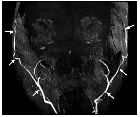 Seventy-six-year-old female with BD/DNC, 3D time-of-flight (TOF) MRI brain angiogram image shows an absence of flow in bilateral intracranial internal carotid arteries with normal flow signals in the bilateral external carotid artery and its branches (white arrows).