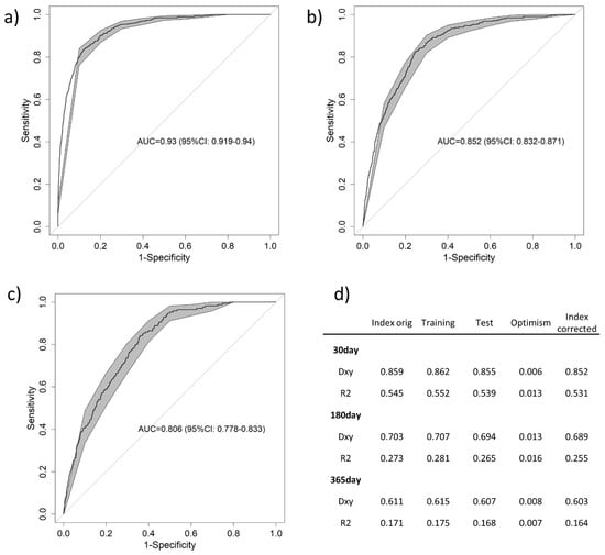Finally, the models’ predictive values were assessed (Figure 1), and the best predictive value was shown for 30-day mortality (Figure 1a) (AUC = 0.930, 95% CI: 0.919–0.940), followed by 180-day mortality (Figure 1b) (AUC = 0.852, 95% CI: 0.832–0.871) and 365-day mortality (Figure 1c) (AUC = 0.806, 95% CI: 0.778–0.833). These results were confirmed by the internal validation parameters (Figure 1d).
