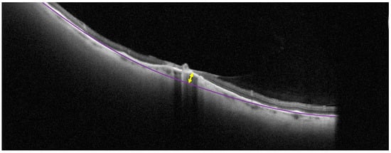 Measurement of choroidal indentation on a cross-sectional optical coherence tomography scan. The purple line represents the level of retinal pigment epithelium. The yellow arrow shows the maximum scleral indentation in the middle of the lesion.