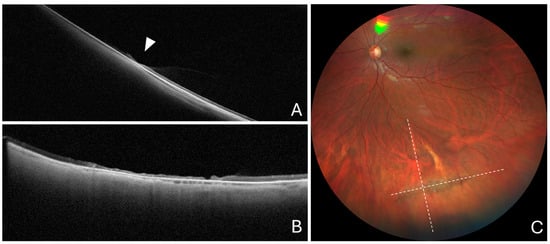 Cross-sectional optical coherence tomography and color fundus photography in a horseshoe retinal break. (A) Cross-sectional optical coherence tomography scan passing along the retinal flap showing no scleral indentation or choroidal thinning. (B) Cross-sectional optical coherence tomography scan passing across the retinal flap showing no scleral indentation. (C) Color fundus photography showing a horseshoe retinal break surrounded by post-laser scars. The dashed lines show the position of optical coherence tomography scans.