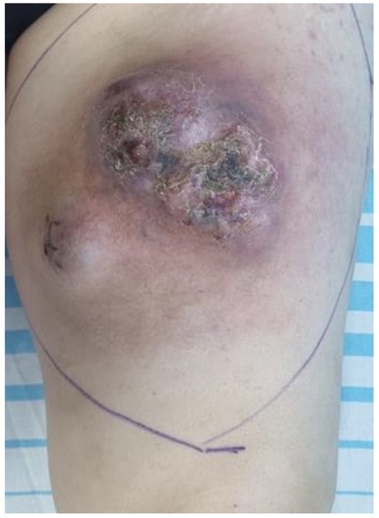 Clinical presentation of the myxofibrosarcoma—nodular aspect with crusted ulcerations, deep insertion affecting the anterior view of left thigh.