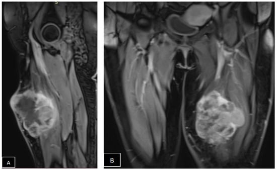 Magnetic resonance imaging (MRI) is the imaging modality of choice in establishing the MFS diagnosis [7]. The standard of care is represented by surgical resection with negative margins before diagnostic confirmation through a biopsy, followed by radiotherapy or chemotherapy for intermediate- and high-grade sarcoma types or rapidly growing cases [22,23]. Complex vascular and plastic surgery reconstructive methods are often required for massive invasive tumors [8].