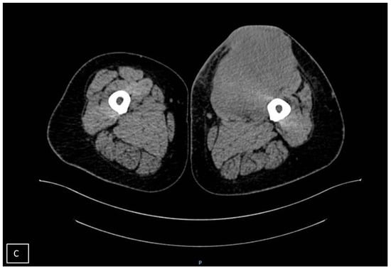 Nuclear magnetic resonance imaging (MRI) of the thighs. (A,B) Sagittal and coronal T1-weighted MRI. (C) Transverse T1-weighted MRI shows deep infiltration of the skin, the subcutaneous tissue, the left quadriceps, the vastus medialis, the vastus intermedius, and the rectus femoris muscles, and a highly intense irregular mass signal typical of the myxoid matrix in subcutaneous tissues, with an ill-defined margin in the upper third of the left thigh.