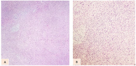 High-grade MFS: hypercellularity with diffuse fusiform cells, pleomorphic atypical cells, areas of necrosis, cells with variable density and multiple atypia, high mitosis, and myxoid background (H&E staining: (A) magnification ×100 and (B) magnification ×200).