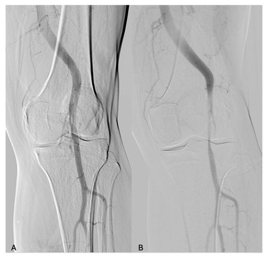 Digital subtraction angiography in a patient affected by PAES with popliteal artery stenosis after dynamic maneuvers. (A) neutral position; (B) dynamic maneuvers of dorsiflexion of the feet.