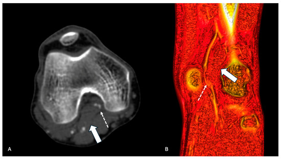 CTA of left inferior limb in a patient with PAES. (A) Coronal section of CTA showing anomalous insertion of the medial head of gastrocnemius (arrow) and occluded popliteal artery (dotted arrow). (B) Sagittal volume rendering showing anomalous insertion of the medial head of gastrocnemius (arrow) and occluded popliteal artery (dotted arrow).