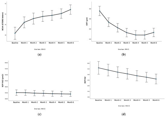 Line graphs of the measurements at baseline and each monthly visit of best corrected visual acuity (BCVA, (a)), central retina thickness (CRT, (b)), superficial capillary plexus fovea avascular zone area (SCP FAZ, (c)), and deep capillary plexus fovea avascular zone area (DCP FAZ, (d)). Error bars represent 95% confidence intervals.