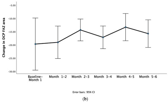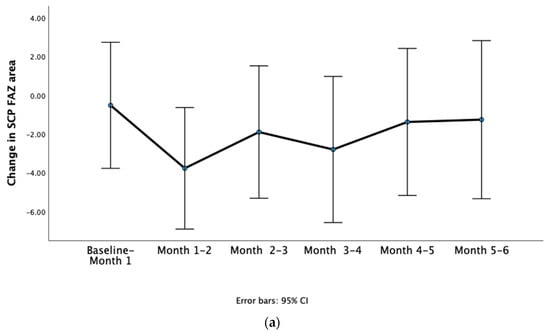Then, the difference between FAZ area measurements in consecutive visits was calculated. As shown graphically in Figure 2a,b, there was variability in the amount of change in the SCP FAZ area and DCP FAZ area occurring every month.