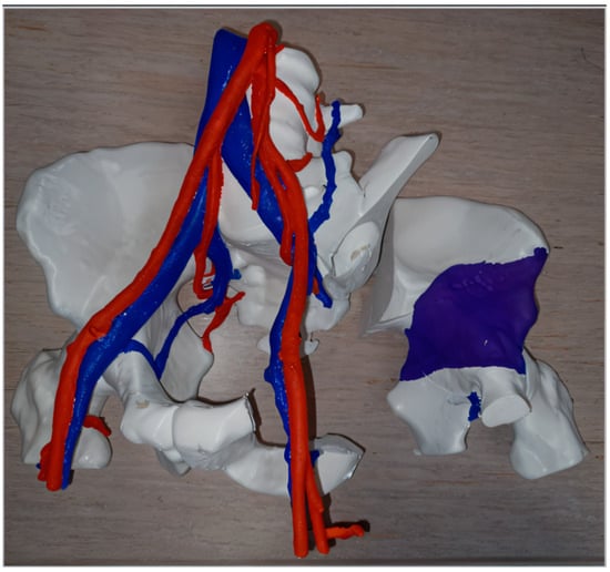 Example of preoperative planning by “independent” 3D printing of the resection of a chondrosarcoma in the left hemi-pelvis (planned resection margins in the right with purple color demonstrating the tumor) and its vascular relationships.