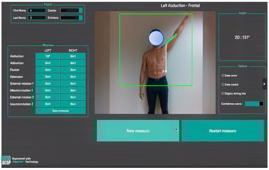 This initially consisted of capturing an individual’s silhouette (silhouette tracking) with several conventional 2D cameras and then using this information to construct a 3D model [61]. This model is then decomposed into several limb segments that are articulated with each other. The movements of the selected segments can then be recorded and analyzed in every plane. These various steps may require several software interfaces. The devices being used have now become lighter and simpler. They are based on the emission of an infrared light towards the patient, whose reflected image is captured and then processed to reconstruct information about depth and, consequently, the third dimension. This is made possible by a unique RGB-D camera that couples color and depth information (RGB: color, D: depth) and the development of algorithms that can optimize its functioning [62]. This is a major technical advance because surface markers are no longer needed, which makes this technology easier to use in a clinic or office (Figure 4). This technology provides fast measurements of joint ROM, with a similar accuracy to photographic captures [63,64].