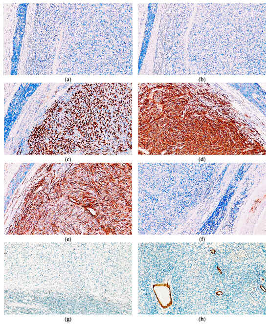 Immunohistochemical evaluation of the recurrent skin lesion proved that the tumour cells were not reactive for (a) MelanA and (b) PRAME. However, the tumour cells displayed moderate immunopositivity for (c) SOX10. Additionally, (d) CD10 and (e) WT1 were strongly and diffusely positive, while (f) CD99 was weakly positive in several areas. (g) CD31 was strongly positive in most of the neoplastic proliferation and (h) ERG was strongly positive in scattered tumour cells.