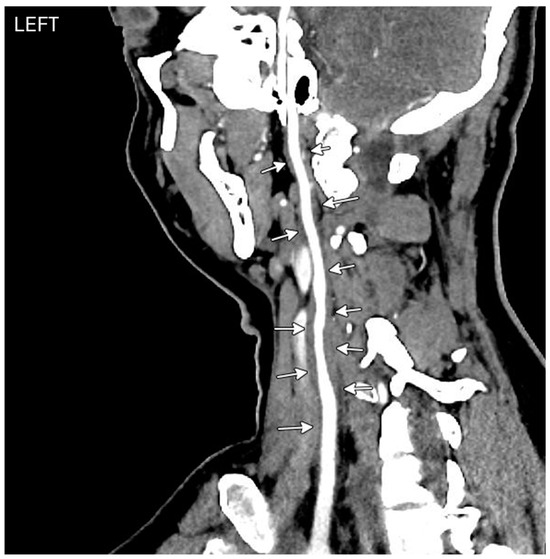 CT angiogram. Left carotid artery centerline reconstructions show diffuse arterial wall thickening (white arrows).