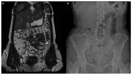 MR enterography showed no significant alteration two years before surgery, when the patient was already symptomatic. The Coronal T2-weighted image does not show signs of right colon amyloidosis (a). The plain abdominal X-ray is divided into three segments, and radiopaque markers are counted for each segment (b). Measurement of colonic transit time based on radio-opaque markers shows delayed colonic transit time (39/60 markers). The distribution of the markers, with a majority in the right region (31/39), suggests reduced motility at the level of the cecum and ascending colon.