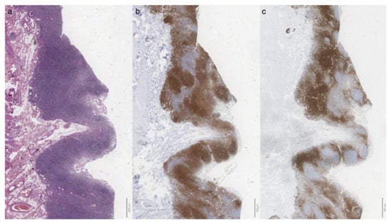 Dense infiltrate was observed within the lamina propria ((a), H&E stain) composed of small CD20+ B lymphocytes organized in follicles (b) admixed with a CD3+ T cell infiltrate (c). Scalebar = 800 microns.