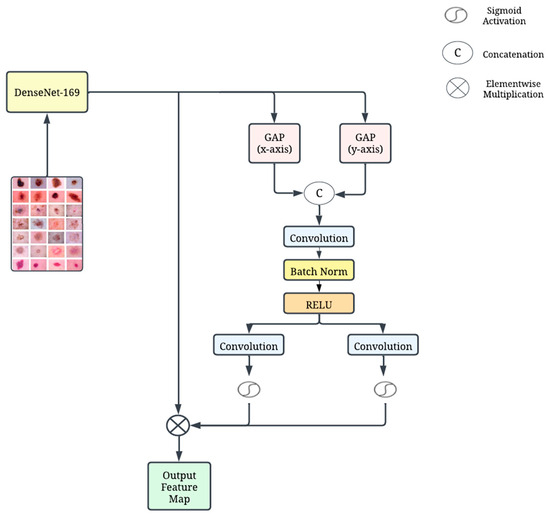 The architecture of modified DenseNet with CoAM is presented in Figure 2. DenseNet-169 is a CNN model that belongs to the family of DenseNets. One of its distinctive features is the dense connectivity pattern between layers, where every layer is connected to and receives input from all previous layers. This dense connectivity alleviates the vanishing-gradient problem and promotes reuse of features, enabling the network to be deeper and efficient in terms of parameter usage. Additionally, DenseNet-169 utilizes bottleneck layers to reduce the number of channels before the dense connectivity, which helps in reducing the computational cost and enhancing feature representation [26]. Between the dense blocks, transition layers with convolution and pooling operations are employed to downsample the feature maps and control the growth of feature maps. This approach helps to maintain a balance between the network’s representational power and computational efficiency. The features obtained from the DenseNet-169 architecture are then passed on to CoAM.