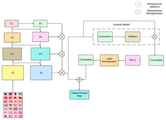 The FPN utilizes the hierarchical structure of a CNN to create a feature pyramid that includes high-level features consistently across different levels of semantics [28]. This method analyzes input images and generates feature maps of proportional sizes at various levels through a fully convolutional layer. The bottom-up pathway is the initial stage of the block, creating a hierarchy of features that includes feature matrices at different scales, with increments of 2. Each level generates output maps of identical dimensions. Following each stage’s residual block, the resulting feature maps are designated with specific labels: C2, C3, C4, and C5, corresponding to the outputs of the conv2, conv3, conv4, and conv5 layers, respectively. These feature maps are produced with strides of 4, 8, 16, and 32 pixels based on the input image. The dimensions of the feature maps produced by the FPN blocks C2, C3, C4, and C5 are 64 channels, 112 × 112 dimensions; 256 channels, 56 × 56 dimensions; 512 channels, 28 × 28 dimensions; and 1024 channels, 14 × 14 dimensions, respectively.
