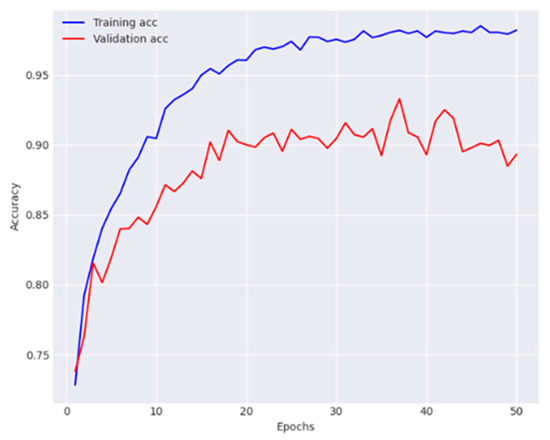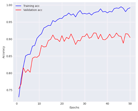The performance metrics obtained for each class are provided in Table 4. The model reported 91.0% average accuracy, 89.8% average recall, 92.5% average precision, and 91.1% average F1-score. Training and validation observations are presented in Figure 8 and Figure 9.