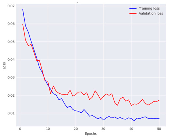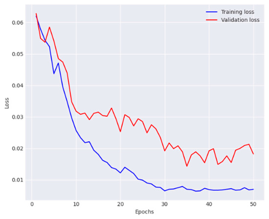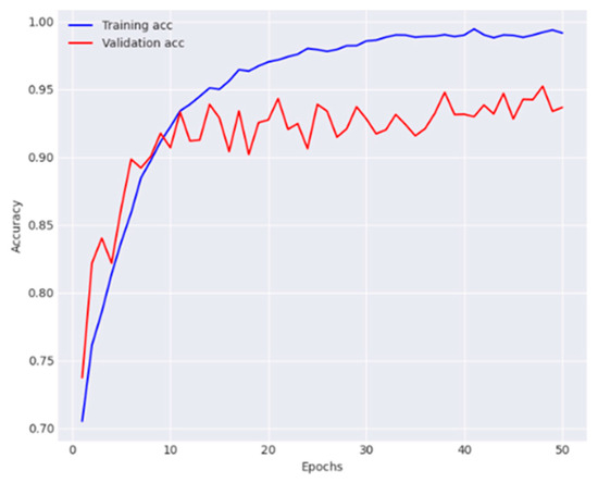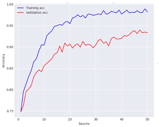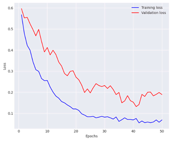 Figure 4 and Figure 5 illustrate the model training and validation process. Furthermore, the network achieved an accuracy of 85.7%, average precision of 85.9%, an average recall of 86.1%, and an average F1-score of 86%. The performance metrics obtained for each class are presented in Table 2.