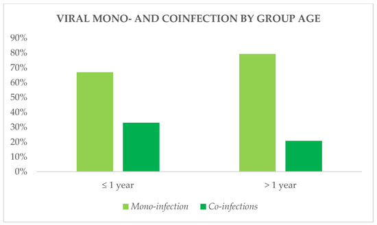 Human coronavirus NL63, adenovirus, metapneumovirus, and parainfluenza viruses 1–3 were detected almost exclusively in coinfections. SARS-CoV-2 was detected equally in both mono-infections (41%) and coinfections (59%), as well as parainfluenza virus 4 (50% vs. 50%) and human rhinovirus/enterovirus (60% vs. 40%). RSV, influenza A/B, and parainfluenza virus 2, furthermore, were identified at higher frequencies in mono-infections compared to coinfections (Figure 4). Coinfections were also identified more frequently in younger children (Figure 5).