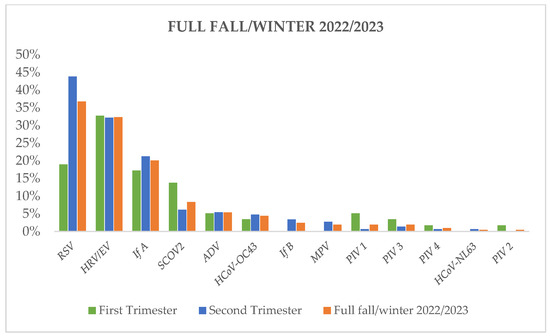 Acute respiratory tract infections (ARTIs) experienced a notable increase, rising from 48 out of 58 (83%) positive samples in September–November 2022 to 130 out of 146 (89%) positive samples in December 2022 to March 2023. While RSV emerged as the predominant agent responsible for ARTIs throughout the entire fall–winter season of 2022/2023, it particularly dominated during the second trimester (December 2022 to March 2023), peaking in the first half of January 2023. Human rhinovirus/enterovirus exhibited greater prevalence than RSV during the first trimester of the season (September 2022 to November 2022).