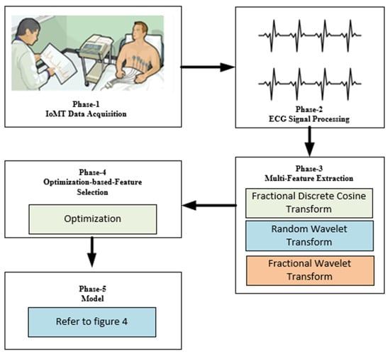 The collected ECG signals were initially preprocessed in order to remove the distortions. Three different types of transform techniques, such as Fractional Discrete Cosine Transform, Radon Wavelet Transform and Fractional Wavelet Transform, were applied to extract the features. The optimal features from the previous step were selected using optimization techniques before sending them to the i-AlexNet architecture for performing the final classification. The workflow of the proposed system is presented in Figure 1.