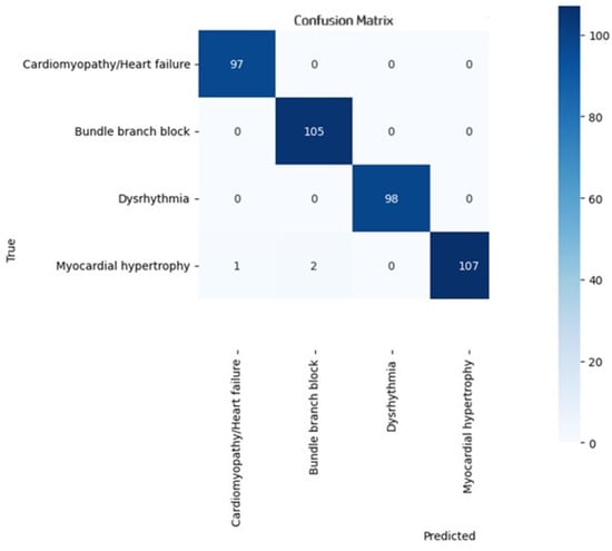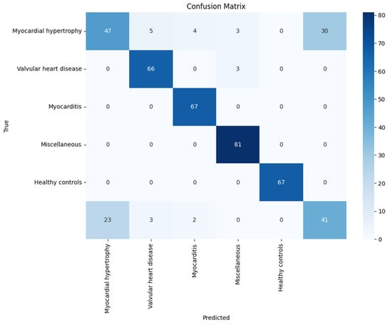 Figure 5 shows that the model produced a significant number of misclassifications, particularly as Healthy Controls, indicating that the model struggles to differentiate Myocardial Hypertrophy from normal ECGs. However, this result was generated without the module of weight imbalance and optimization. However, Figure 6 shows that the classification of diagnostic classes was produced by the module after weight imbalance and optimization were applied.
