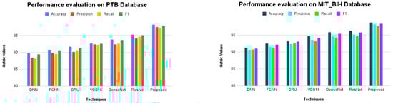 The performance of the proposed i-AlexNet model was compared against the conventional algorithms to interpret its performance supremacy. The algorithms, such as Deep Neural Networks (DNNs), Fully Connected Neural Networks (FCNNs), Gated Recurrent Units (GRUs), VGG16, DenseNet and ResNet, were considered for evaluation. These algorithms were applied to the PTB and the MIT_BIH database and the obtained results are presented in Table 3 and Figure 6 and Figure 7 The CNN model produced an accuracy of 89.8% for the PTB database and 91.3% for the MIT_BIH database. FCNN exhibited 90.8% accuracy, 89.8% precision, 89.5% recall and 90.4% F1 score for the PTB database. Also, the FCNN model produced 92.6% accuracy, 91.5% precision, 91.2% recall and 92.2% F1 score. The performance of the GRU and VGG16 models are closer to each other, with an accuracy of 91.7% and 92.7% for the PTB database and 93.2% and 94.7% for the MIT_BIH database, respectively. The DenseNet and ResNet models offer higher accuracy for both the ECG databases. However, the proposed i-AlexNet model produces efficient accuracy in classification, with 98.2% for the PTB database and 98.8% for the MIT_BIH database.