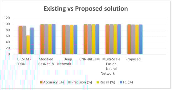 Furthermore, the outcomes of the proposed approach are also compared with the state-of-the-art methods in the literature, and the outcomes are shown in Table 4 and depicted in Figure 10. Our method, utilizing the AlexNet architecture, attained an accuracy rate of 98.8%, a precision of 98.2%, a recall of 97.7% and an F1 score of 98.4%. These outcomes suggest that our approach is highly competitive, with performance metrics aligning with those of cutting-edge methods. Originally crafted for image classification duties, the AlexNet structure displayed adaptability and effectiveness in managing ECG data. Its deep convolutional layers can adeptly capture patterns within the data, resulting in robust feature extraction and classification capabilities. This adaptability proves beneficial in ECG analysis scenarios where signal patterns are complex and vary significantly among patients. When compared to techniques like BiLSTM, FDDN and Deep Network, our method exhibits superior performance across all assessed metrics. While BiLSTM and FDDN achieved an F1 score of 88%, our approach attained 98.4%, showcasing an enhancement in performance. Similarly, although Deep Network scored a 97% on the F1 metric, our method surpassed it by a margin of 1.4%. Moreover, our methods’ performance stands on par with that of the Modified ResNet18, CNN BiLSTM and Multi-Scale Fusion Neural Network approaches, all achieving good results. The slight differences in accuracy and completeness between these techniques and our suggested strategy showcase the effectiveness of the AlexNet design in maintaining a rounded performance across measurements. To sum up the proposed approach, utilizing the AlexNet design showcases a good degree of precision, accuracy, completeness and F1 score, establishing it as a trustworthy method for ECG signal categorization. The findings indicate that the AlexNet-driven technique can effectively rival and even outperform cutting-edge methods in instances, underlining its potential for broad application in ECG analysis and related domains.
