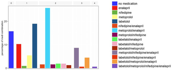 Type and percentages of baseline antihypertensive medications. Combination of medications: 0–4 medication combinations; color legend on the right with the various combination of medications.