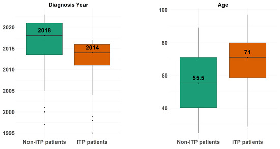 Figure 1 depicts the boxplots of the patients’ ages (right-hand side) and year of disease diagnosis (left-hand side), across the ITP patients and non-ITP patients.