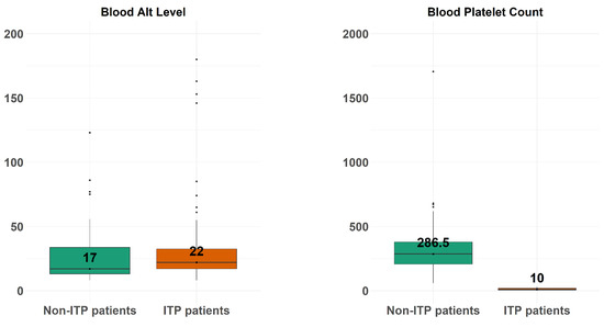 Figure 2 depicts the boxplots of the blood platelet count (right-hand side) and blood alt level (left-hand side) across the ITP patients and non-ITP patients.