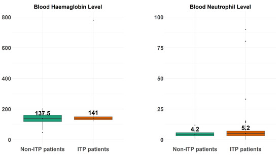 Figure 3 depicts the boxplots of the blood neutrophil level (right-hand side) and blood haemoglobin level (left-hand side) across the ITP patients and non-ITP patients.