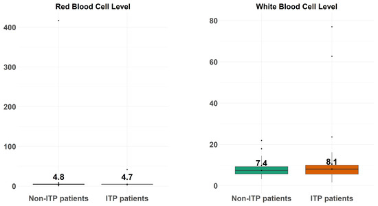 Figure 4 depicts the boxplots of the white blood cell count (right-hand side) and red blood cell count (left-hand side) across the ITP patients and non-ITP patients.
