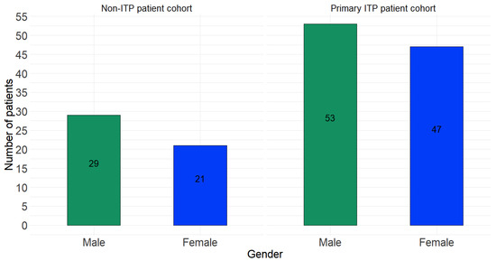 Figure 5 presents the gender distributions (of male and female) in the case of ITP and non-ITP patients. One can see that in the ITP patient cohort, the percentage of males is 53%, and in the non-ITP cohort the corresponding percentage is 58% (i.e., 29 out of 50 patients). The distributions of male vs. female patients in each cohort are quite close (53–47% in the ITP cohort and 58–42% in the non-ITP cohort); the distributions of males in each cohort and the ones of females in each cohort are also quite similar. Finally, Table 1 presents all numeric variables that the previously described dataset contains, along with a small description of each, their minimum, maximum, median and mean values, as well as their reference/normal ranges.