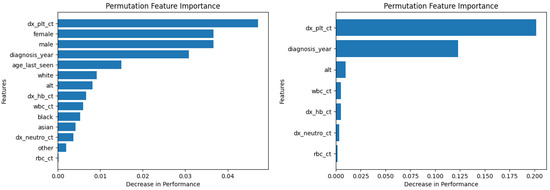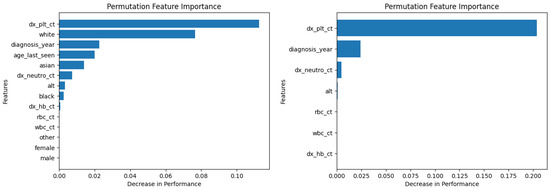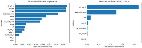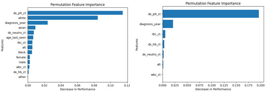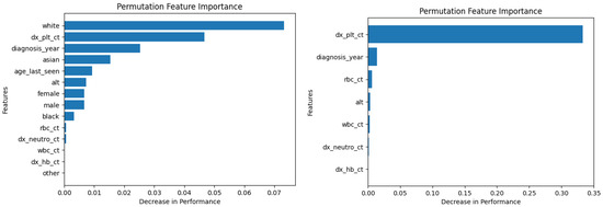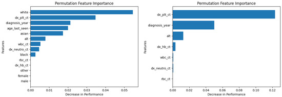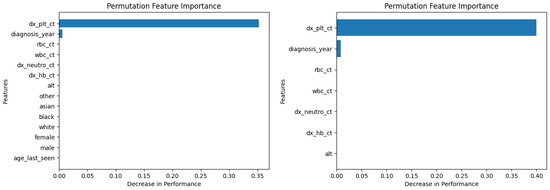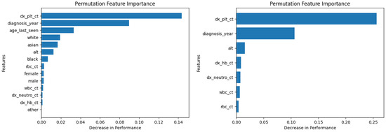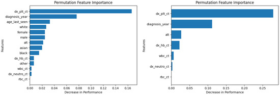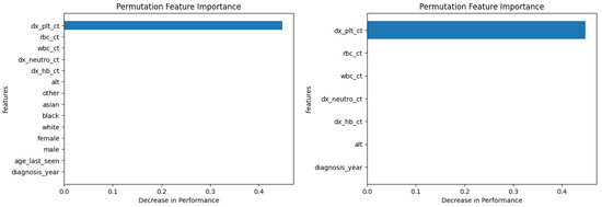 Similarly, Figure 10, Figure 11, Figure 12, Figure 13, Figure 14, Figure 15, Figure 16, Figure 17, Figure 18 and Figure 19 show the permutation feature importance on the training set (and test set) for the LogR, SVM-LN, SVM-RBF, 2-NN, and 12-NN models, respectively, in the case of the demographic-aware (on the left side) and demographic-unaware (on the right side) approach. In all cases, one can see that ‘dx_plt_ct’ is in the top-two most important variables.