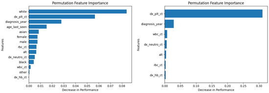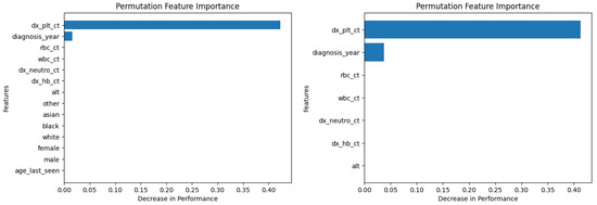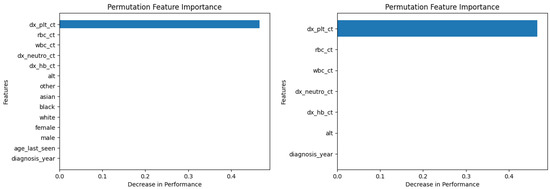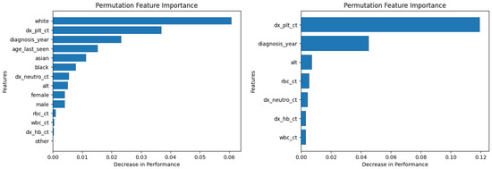 Figure 6 and Figure 7 show the permutation feature importance on the training and test sets, respectively, for the RF model in the case of the demographic-aware (on the left side) and demographic-unaware (on the right side) approach. Let us note that there were similar distributions and findings across all training and test sets of each fold (of the five-fold cross validation); this was the case for all ML methods that we present in this subsection. Figure 8 and Figure 9 illustrate the same information for the DT model. In all these Figures and cases, one can see that the most important and influential input variable for the ML model’s decision is ‘dx_plt_ct’, i.e., the blood platelet count, regardless if we are examining the training or the test set. This is consistent with medical findings; medical experts mainly diagnose ITP based on the platelet count. Let us note that these two methods (RF and DT) are the ones that: (i) achieved the best (and perfect or almost perfect) performance in diagnosing ITP (according to Table 2) compared to the other ML models; (ii) are fair in terms of the sensitive variables (age, gender and race), as well as are the fairest among all ML models (according to Table 3); (iii) achieved the same performance and fairness in the demographic-aware and demographic-unaware approach.