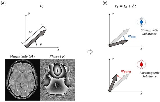 Magnetic susceptibility decay. (A) Representation in the xy plane of the magnetization vector of a single voxel at the initial time t0, the vector is described by its magnitude (M) and phase (φ) relative to the reference axis (x-axis in this representation), below is the representation of the magnitude and phase images of an axial brain slice. (B) After a time ∆t has passed, the magnetization vector will evolve differently depending on the local magnetic field caused by its neighbors. In the case of a diamagnetic surrounding (represented by the blue dipole), the magnetization will rotate in a clockwise direction, while in the case of a paramagnetic surrounding (represented by the red dipole), the magnetization will rotate in a counterclockwise direction. Notice that in both cases, the magnitude of the magnetization decays.