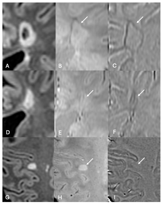Paramagnetic rim lesions in SWI and SWI-phase images. The first FLAIR image (A) shows a cavitated MS plaque with an intense paramagnetic rim visible in both SWI (arrow in (B)) and SWI-phase (arrow in (C)) images. In another chronic active lesion (D), the paramagnetic rim is visible only in SWI-phase (arrow in (F)), but not in SWI (arrow in (E)), illustrating the higher sensitivity of SWI-phase in detecting paramagnetic rims. Similarly, in the bottom-down lesion (G), which appears to be a chronic inactive lesion in SWI (arrow in (H)), it is possible to visualize a fainty paramagnetic rim (I) in the SWI-phase map (arrow in (I)).